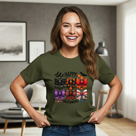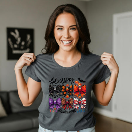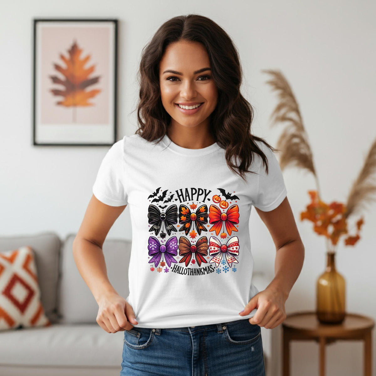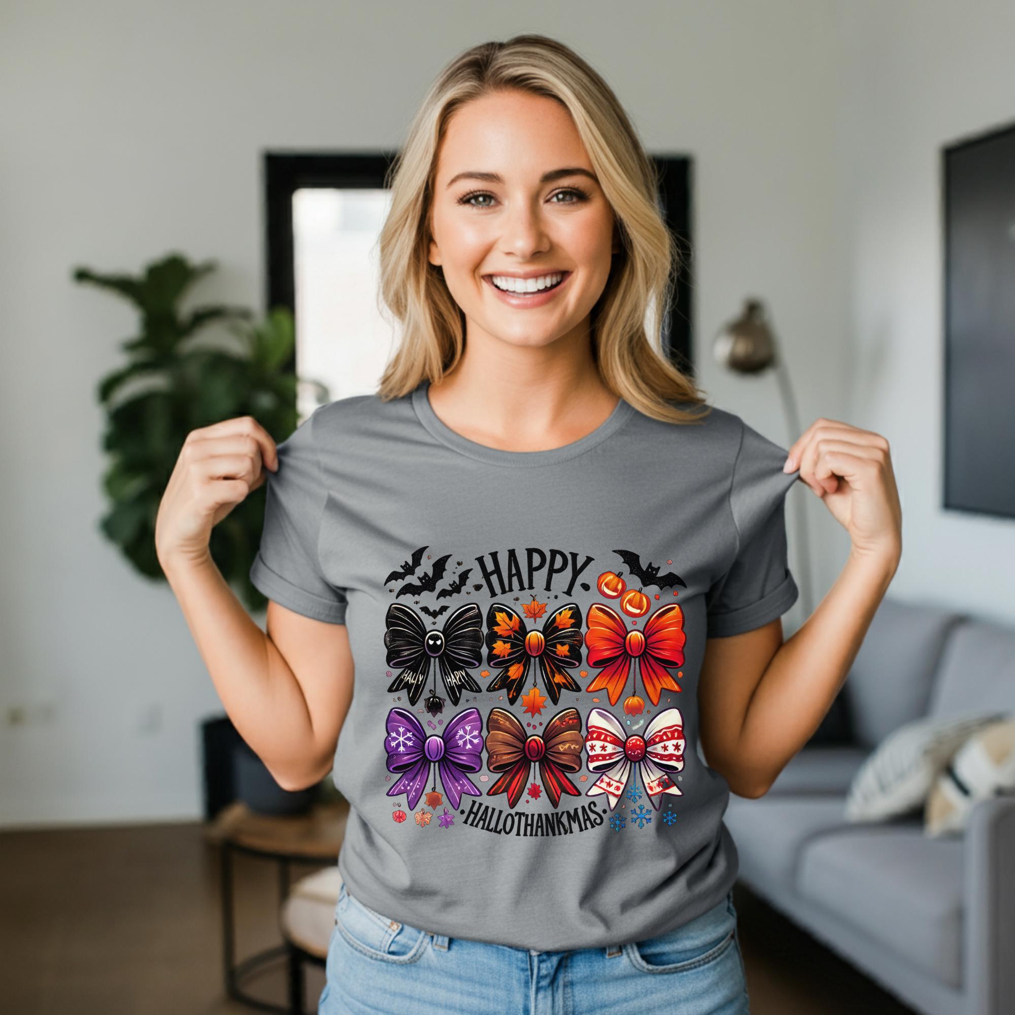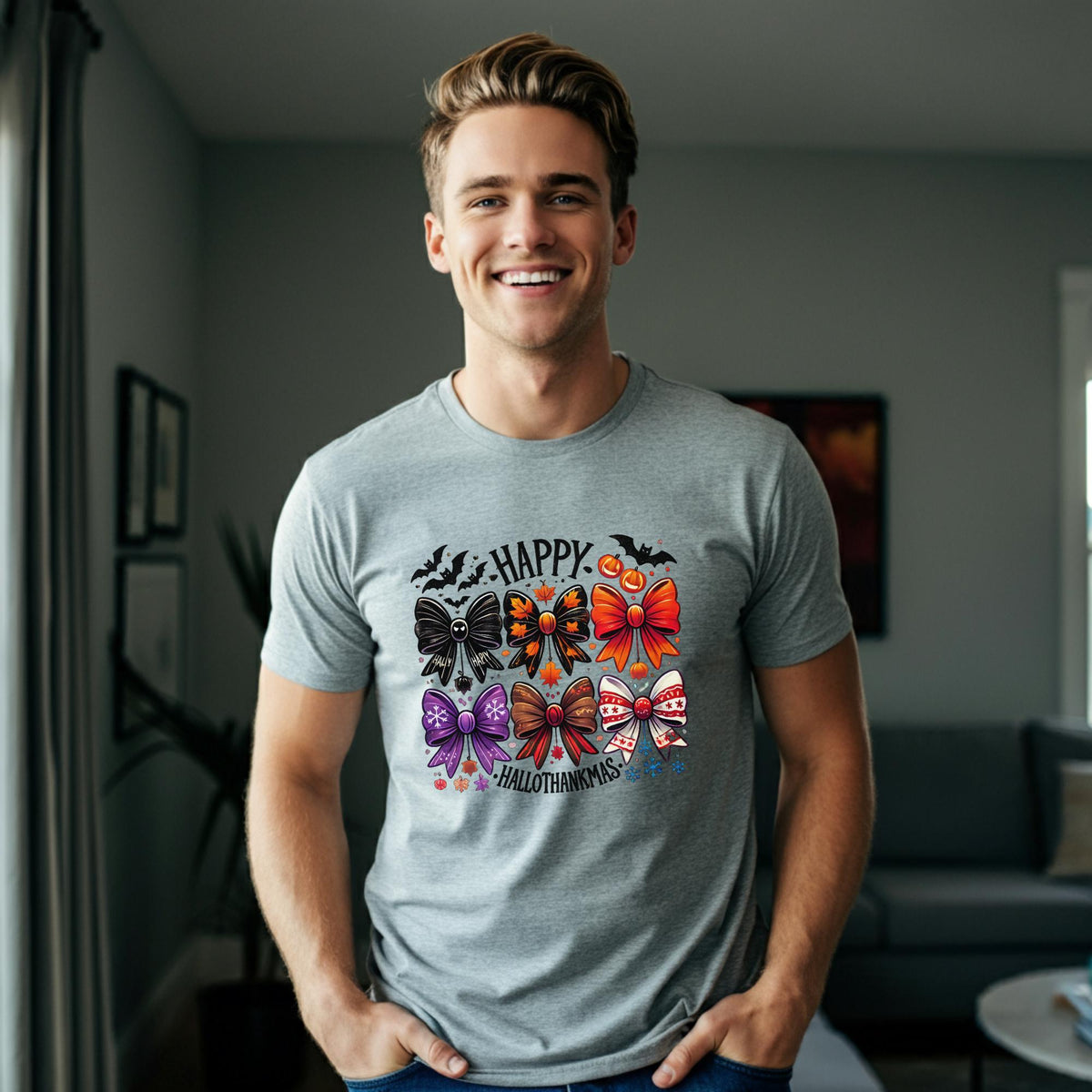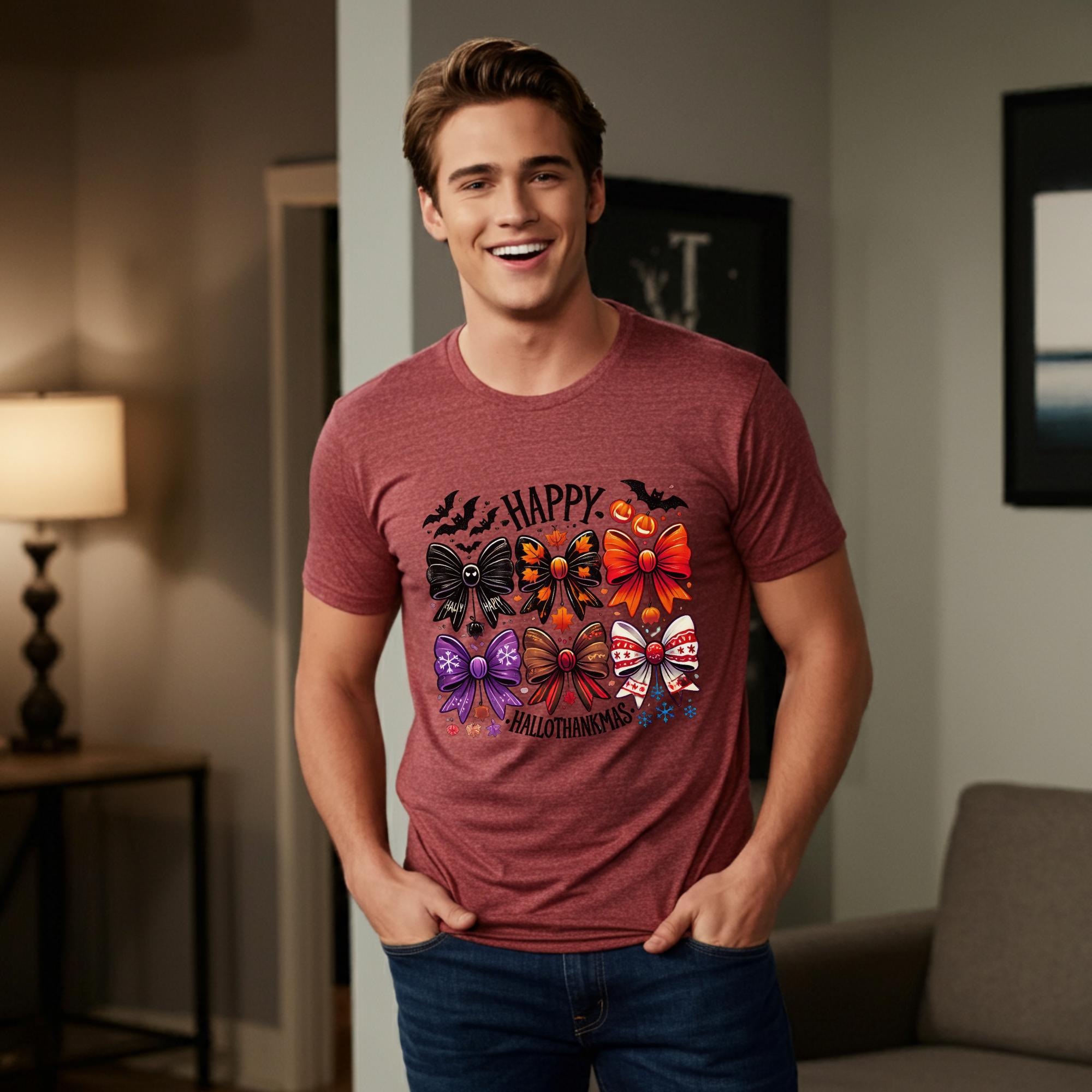 Happy Hallothankmas Unisex T-Shirt | Funny Holiday Mashup Tee | Halloween & Thanksgiving Fun | Unique Festive Apparel for All | Great GiftCelebrate the best of both worlds this holiday season with our Happy Hallothankmas Unisex T-Shirt! This fun and quirky tee blends the spooky vibes of Halloween with the warmth of Thanksgiving, making it the perfect addition to your festive wardrobe. Whether you're attending a Halloween party, a Thanksgiving gathering, or simply want to spread holiday cheer, this shirt is designed to keep you comfortable and stylish.Product Features: