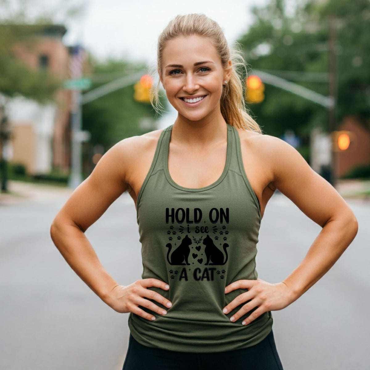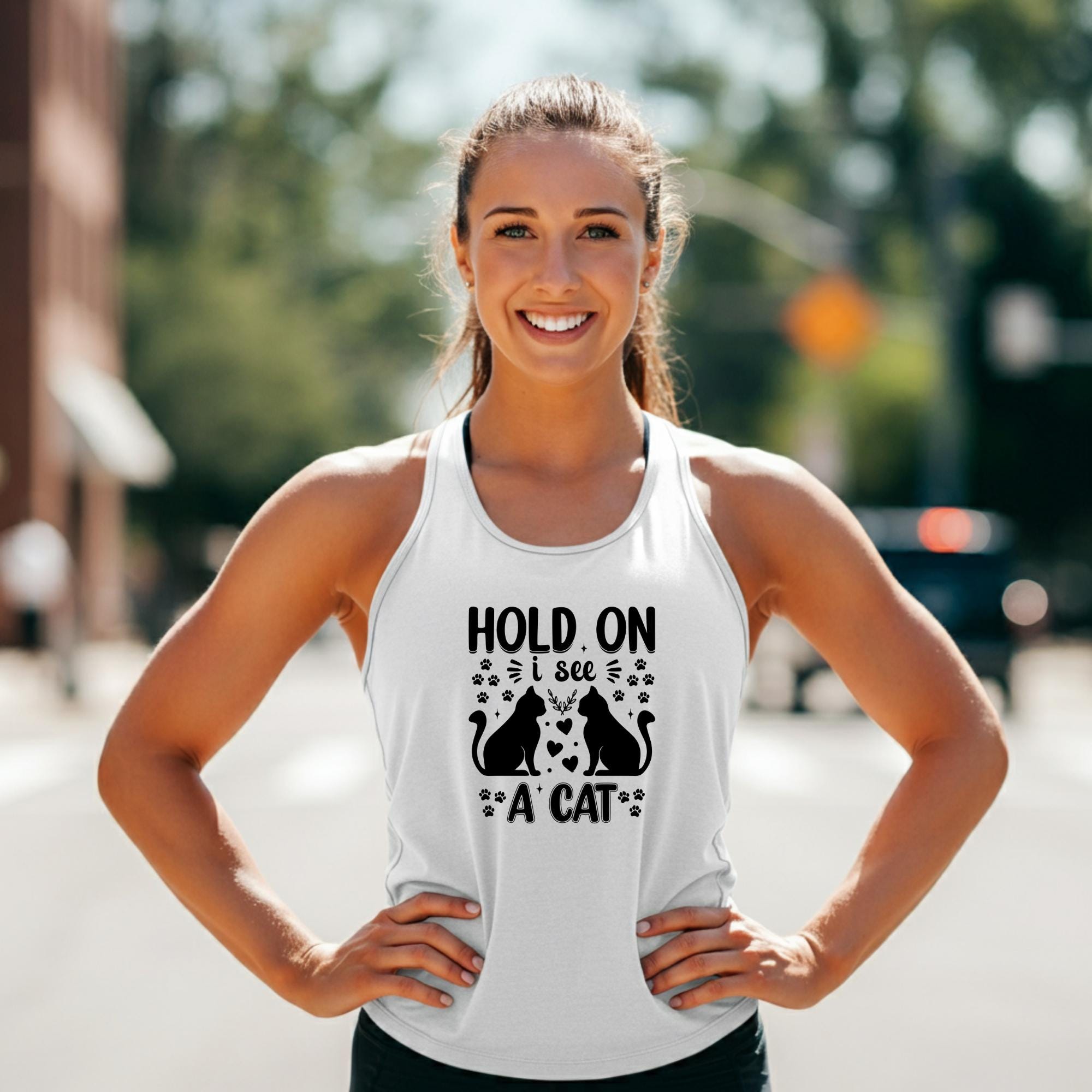 Hold On I See A Cat Racerback Tank - Funny Cat Lover Gift, Unisex Cat Shirt, Cute Pet Tee, Perfect for Cat Lovers EverywhereIntroducing the Hold On I See A Cat Racerback Tank—the perfect blend of comfort and style for all cat lovers! This tank is crafted from an exceptionally soft poly-viscose blend, ensuring you stay comfortable while making a bold statement about your love for cats.Features:- Flattering Draped Silhouette: Designed with a relaxed, drapey fit that flatters all body types, this tank offers a stylish round neck and racerback for an effortlessly chic look.- Versatile Color Options: Available in a variety of solid, marble, neon, and striped colors, you can choose the perfect hue to match your personal style or mood.- Quality Construction: With side seams for a tailored fit, a merrowed bottom hem for added durability, and sheering at the racerback seam, this tank is built to last while maintaining its stylish appearance.- Casual and Chic: Perfect for layering or wearing solo, this tank can be dressed up with a cardigan or worn with shorts and sneakers for a relaxed day out. It’s a must-have addition to any wardrobe.Benefits:- Express Your Personality: This tank showcases a playful “Hold On I See A Cat” graphic, allowing you to share your love for felines in a fun and fashionable way. It’s perfect for sparking conversations and smiles wherever you go!- Ideal Gift for Cat Lovers: Searching for a thoughtful gift? This racerback tank makes a delightful present for birthdays, holidays, or just to brighten someone's day, catering to all the cat enthusiasts in your life.- Comfort Meets Versatility: The soft poly-viscose blend ensures all-day comfort, making it suitable for any occasion, from lounging at home to running errands or meeting friends.- Easy to Care For: The durable material allows for easy washing and quick drying, so you can enjoy your favorite tank without the hassle of special care.Make a statement while staying comfortable—grab your Hold On I See A Cat Racerback Tank today! Click the button above to add it to your cart and embrace your love for cats with style!