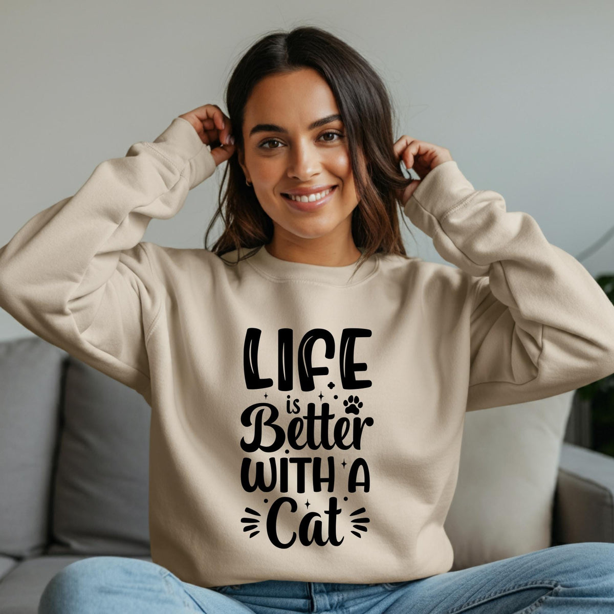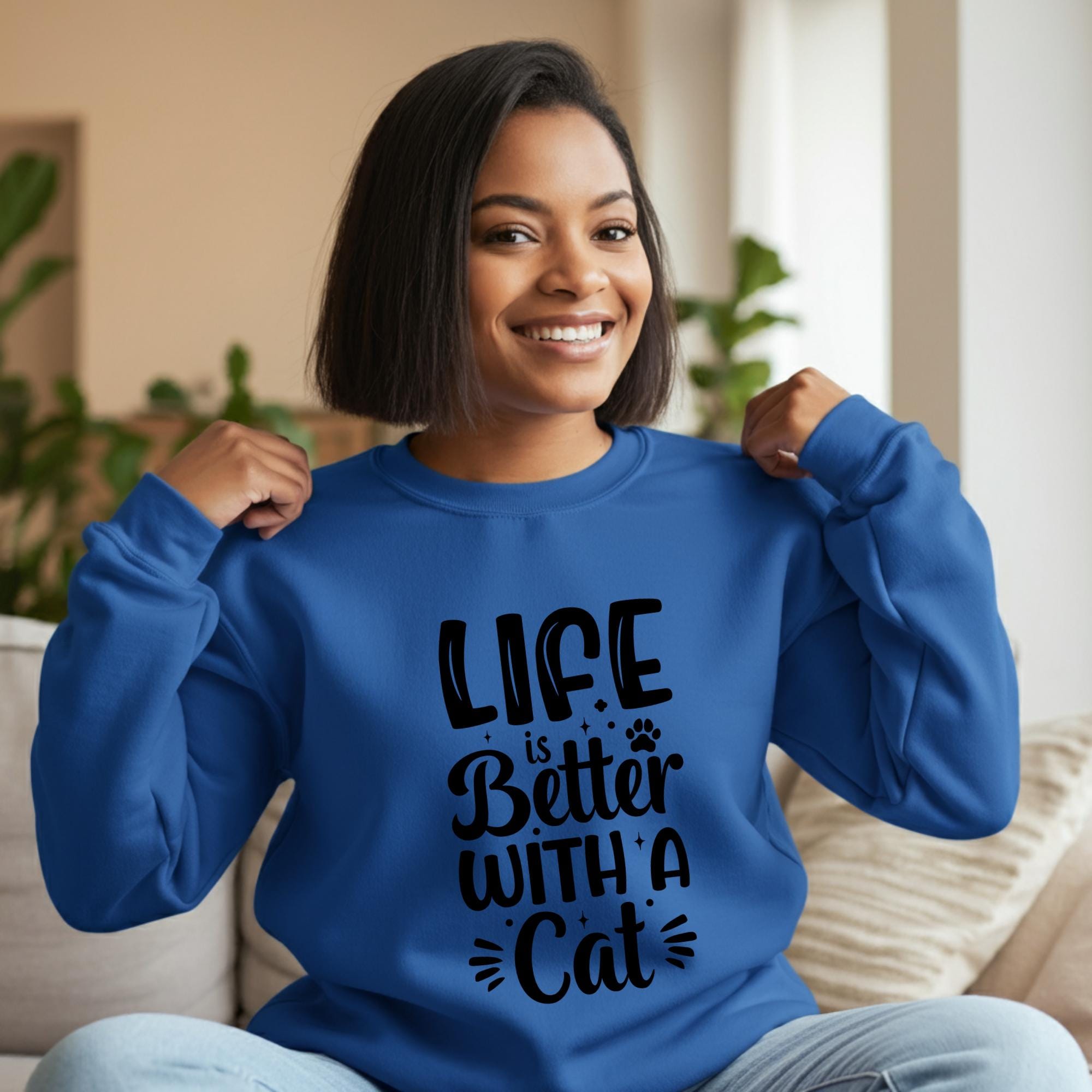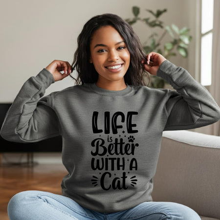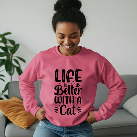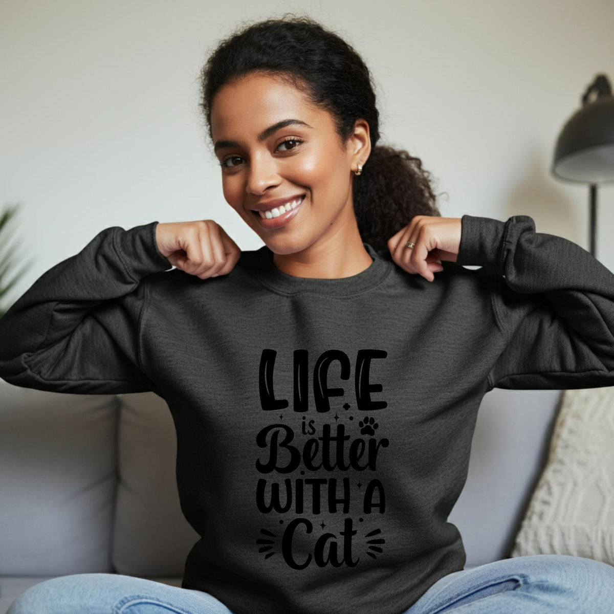 - Unisex Fit: Tailored to fit everyone, making it an ideal choice for cat moms and dads alike. - Durable Construction: Reinforced stitching ensures long-lasting wear, so you can enjoy your sweatshirt for years to come. - Stylish Design: Features a trendy crewneck style that pairs effortlessly with any outfit, perfect for casual outings or cozy nights in. - Easy Care: Machine washable for your convenience, retaining its softness and shape after every wash.Benefits:- Express Your Love: This sweatshirt allows you to proudly display your love for cats and connect with other cat enthusiasts. - Great Gift Idea: Perfect for birthdays, holidays, or special occasions—surprise the cat lover in your life with this thoughtful gift. - All-Season Wear: Lightweight yet warm, this sweatshirt is perfect for layering or wearing alone throughout the year.Why You'll Love It: Snuggle up in the ultimate comfort of our "Life Is Better With A Cat" sweatshirt, where style meets warmth. Whether you're curling up with your cat at home or running errands, this sweatshirt will keep you cozy and looking great.Don't wait! Show off your cat-loving spirit today—order your "Life Is Better With A Cat" Unisex Crewneck Sweatshirt now and enjoy the perfect blend of comfort and style!