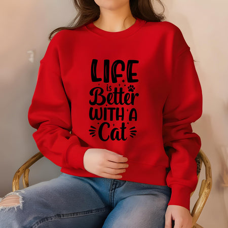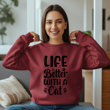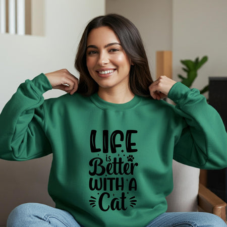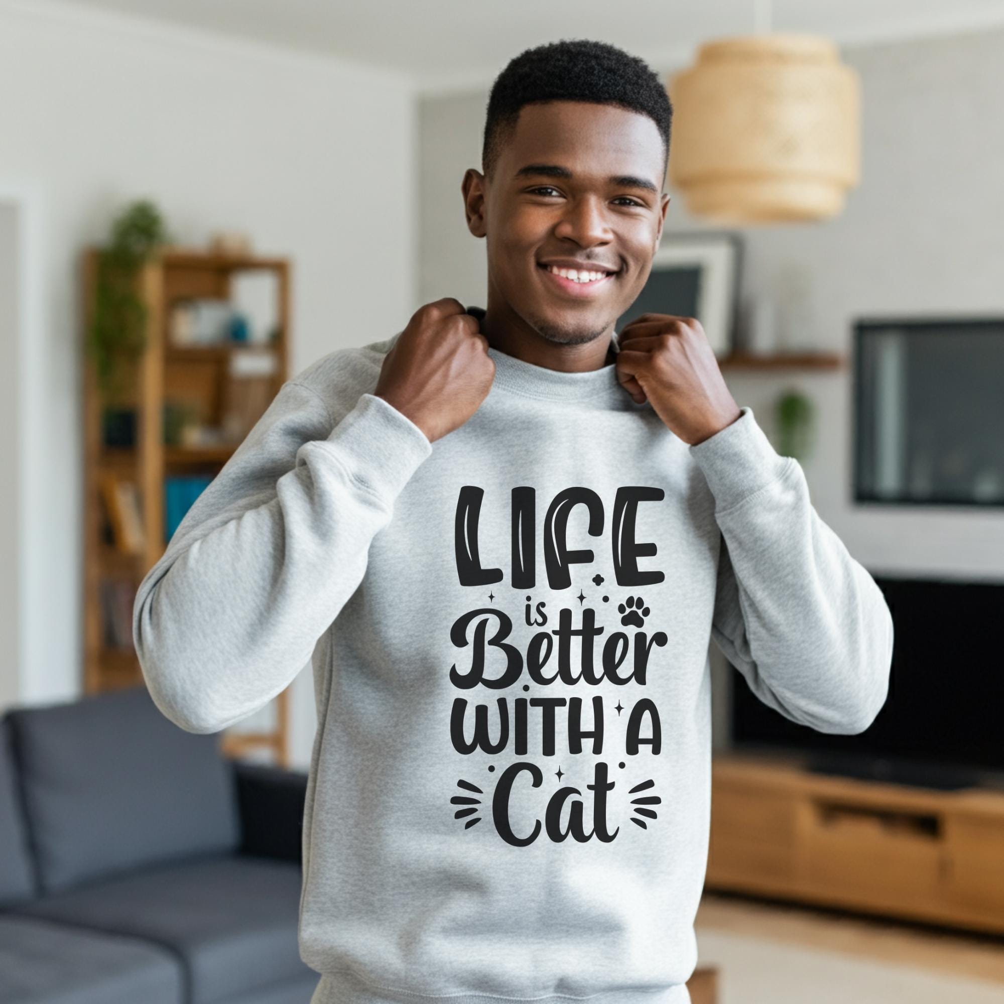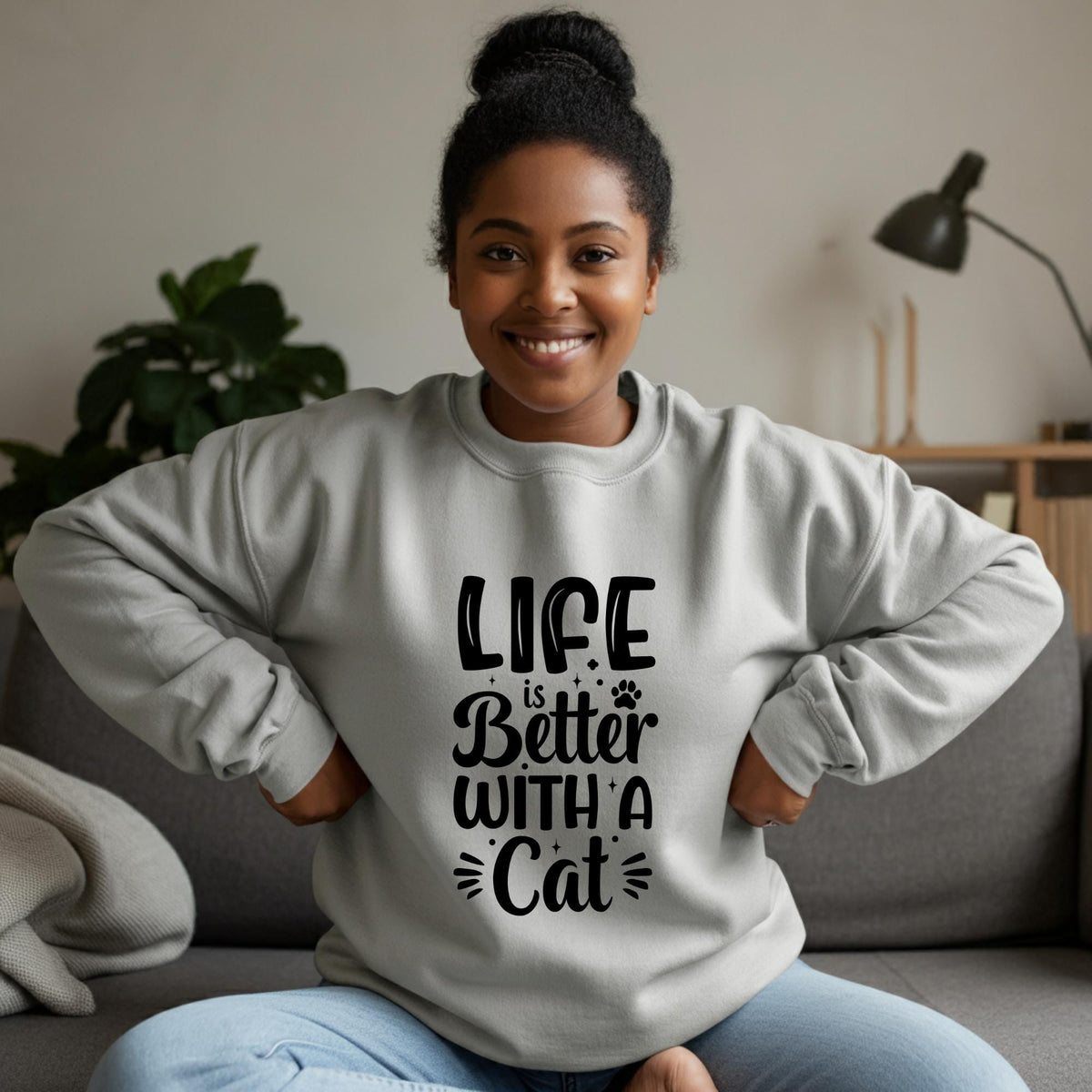 - Unisex Fit: Tailored to fit everyone, making it an ideal choice for cat moms and dads alike. - Durable Construction: Reinforced stitching ensures long-lasting wear, so you can enjoy your sweatshirt for years to come. - Stylish Design: Features a trendy crewneck style that pairs effortlessly with any outfit, perfect for casual outings or cozy nights in. - Easy Care: Machine washable for your convenience, retaining its softness and shape after every wash.Benefits:- Express Your Love: This sweatshirt allows you to proudly display your love for cats and connect with other cat enthusiasts. - Great Gift Idea: Perfect for birthdays, holidays, or special occasions—surprise the cat lover in your life with this thoughtful gift. - All-Season Wear: Lightweight yet warm, this sweatshirt is perfect for layering or wearing alone throughout the year.Why You'll Love It: Snuggle up in the ultimate comfort of our "Life Is Better With A Cat" sweatshirt, where style meets warmth. Whether you're curling up with your cat at home or running errands, this sweatshirt will keep you cozy and looking great.Don't wait! Show off your cat-loving spirit today—order your "Life Is Better With A Cat" Unisex Crewneck Sweatshirt now and enjoy the perfect blend of comfort and style!